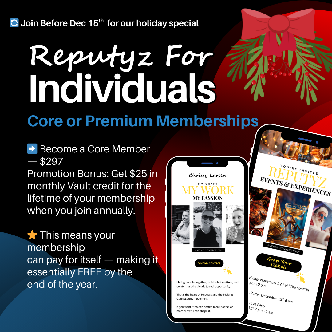 From workshops to mixers, from coaching to collaboration, the Reputyz network helps you build your circle of influence while staying true to who you are. Because when people feel connected, they don’t just support your journey, they become part of it.