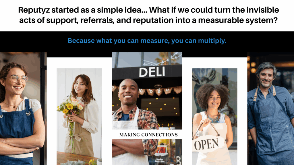 Not ads, not logos, not corporate messaging. Reputyz helps you turn everyday interactions into the relationships, referrals, and community influence that grow businesses.